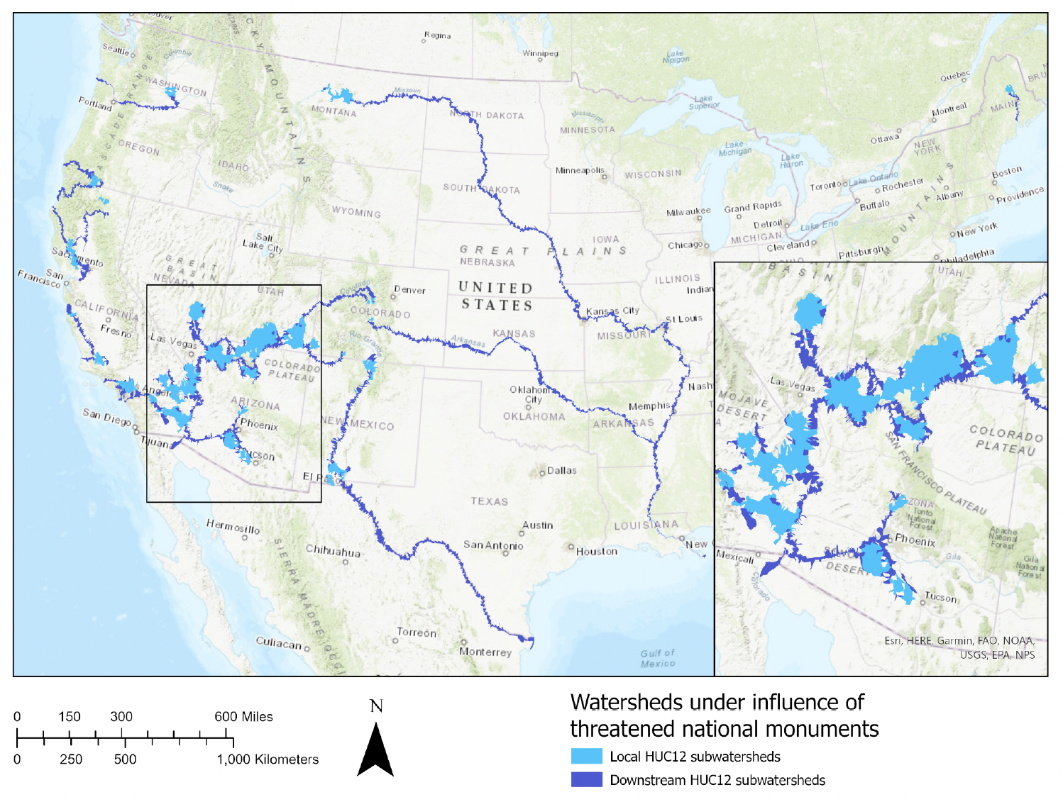 Figure 1: Local and downstream watersheds influenced by 31 at-risk national monuments in the United States.