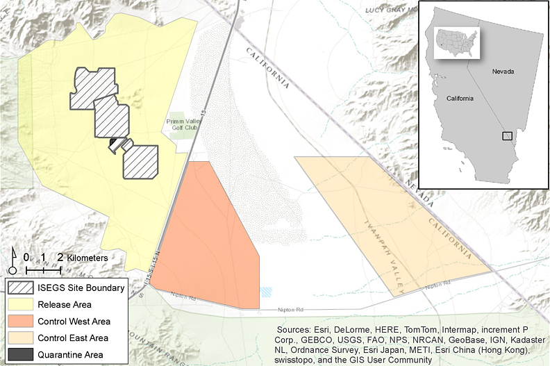 The Ivanpah Solar Electric Generating System project footprint (white boundary), as well as the locations of the translocated and resident (yellow area), control west (orange), and control east (beige) study groups also are shown.